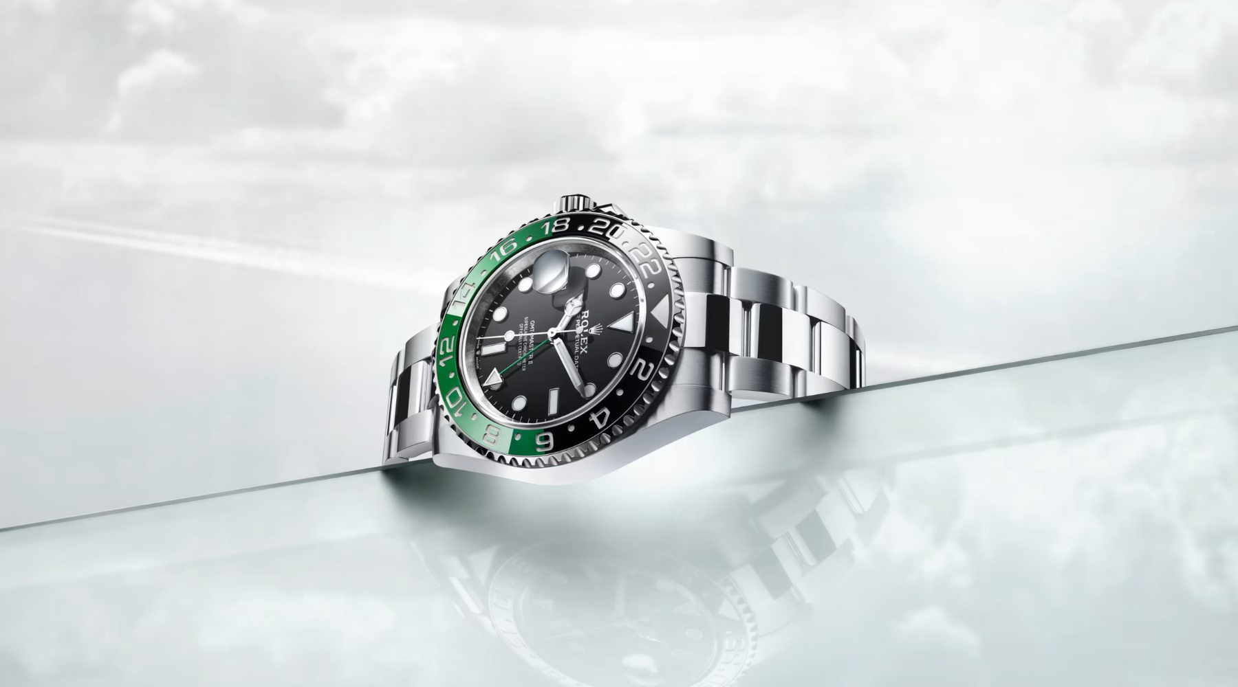 Como parte de la línea Professional de Rolex, el GMT-Master II ofrece legibilidad excepcional en cualquier circunstancia gracias a su visualización Chromalight. Sus índices geométricos —triángulos, círculos y rectángulos— y sus amplias manecillas están recubiertos con material luminiscente de larga duración. Esta versión presenta una configuración poco convencional: la corona y el protector de corona se sitúan en el lado izquierdo de la caja, mientras que la ventana de fecha con lente Cyclops aparece a las 9 en punto, reforzando su carácter distintivo.