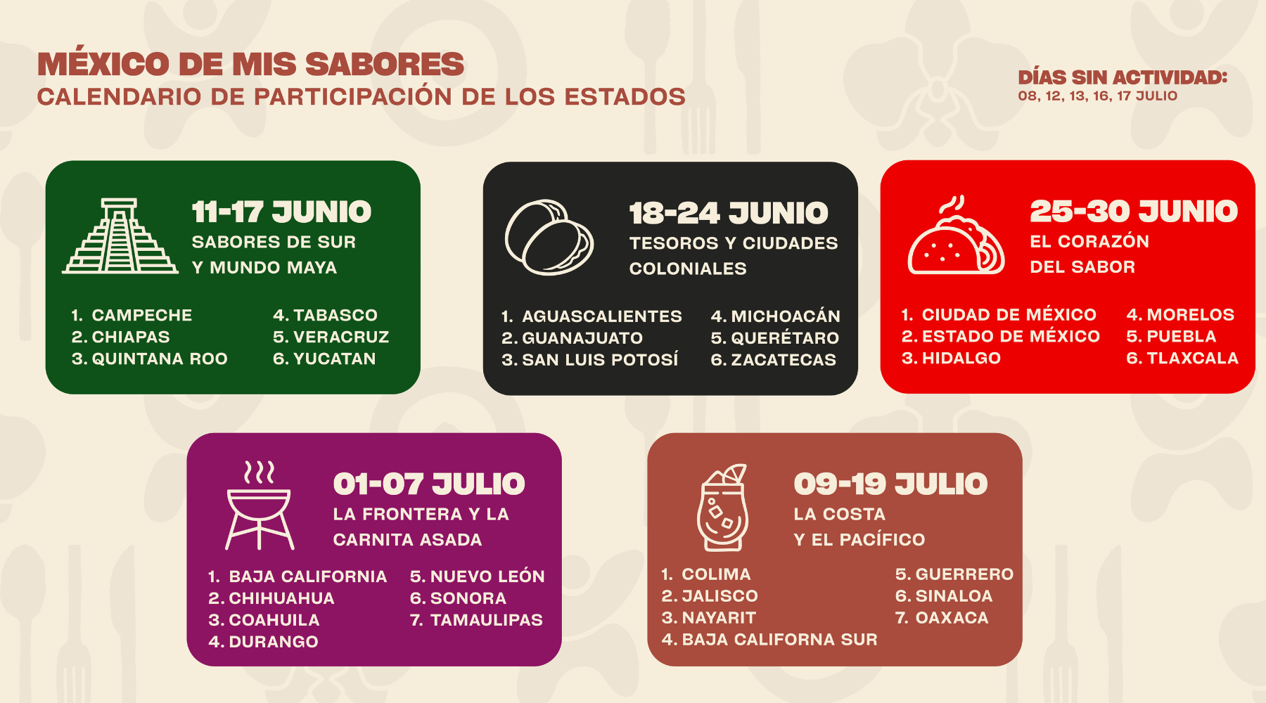 Uno de los pilares del festival será su propuesta gastronómica. El espacio reunirá una curaduría culinaria que recorrerá los sabores de los 32 estados de la República, combinando tradición e innovación. El proyecto contará con la participación de México de Mis Sabores, además de dos cantinas creadas por el reconocido restaurante Contramar, uno de los referentes de la cocina capitalina.