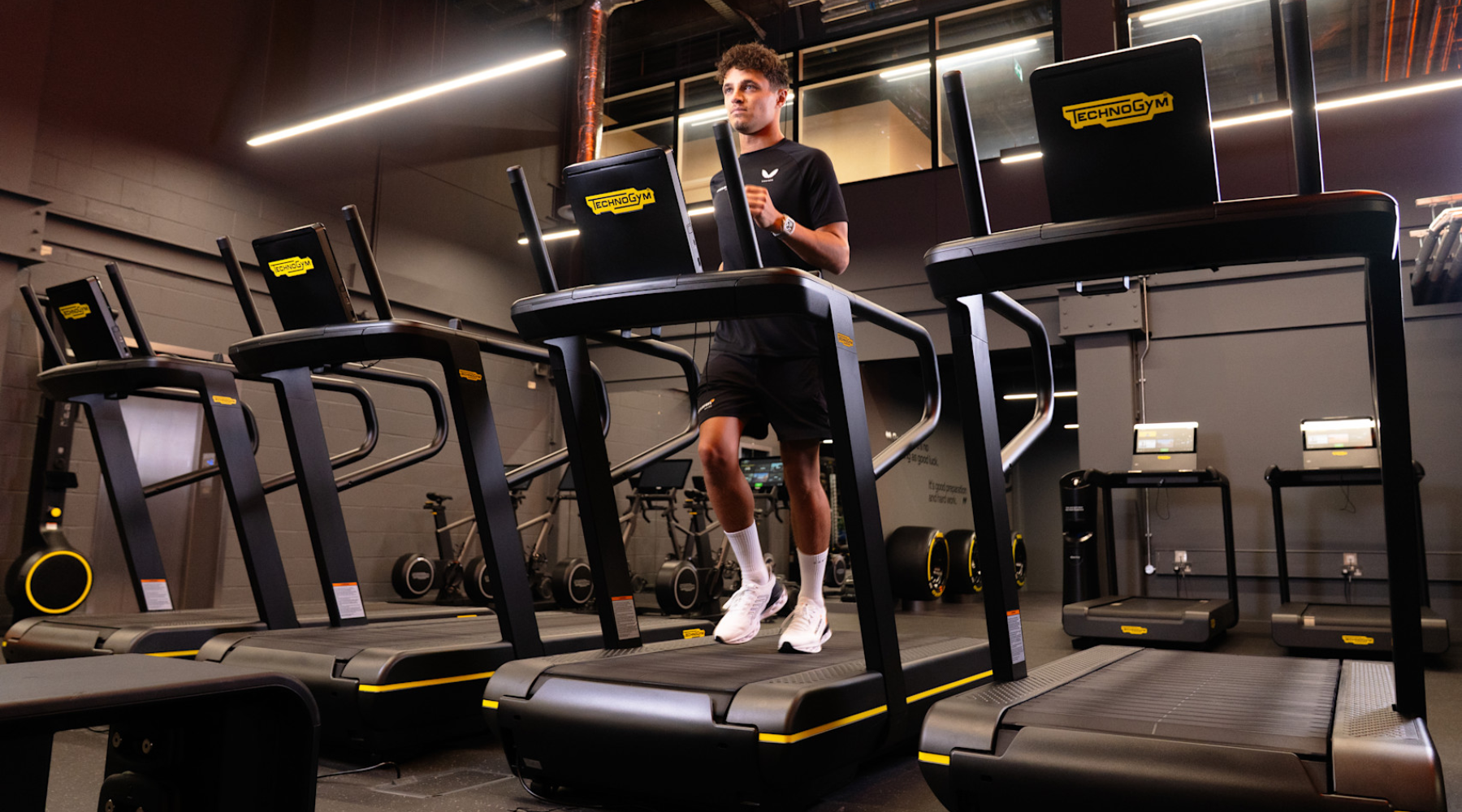 En el gimnasio del equipo se utilizan diferentes soluciones de cardio como cintas profesionales y bicicletas inteligentes conectadas a programas de entrenamiento interactivos. Entre ellas se encuentran plataformas como la cinta Excite Run y la bicicleta indoor Technogym Ride, que permiten simular rutas y monitorear variables como potencia, ritmo cardíaco y resistencia. Este tipo de herramientas ayudan a entrenar el sistema cardiovascular dentro de rangos específicos de intensidad, algo fundamental para mantener la resistencia sin generar fatiga excesiva.