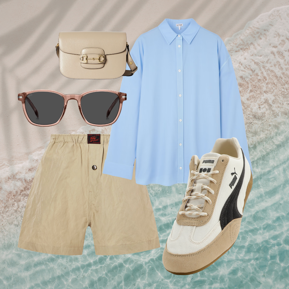 Camisa, Loewe. Short, Willy Chavarria. Lentes, BOSS. Bolso, Gucci. Tenis, Puma x Nahmias. Cortesía: de las marcas.
