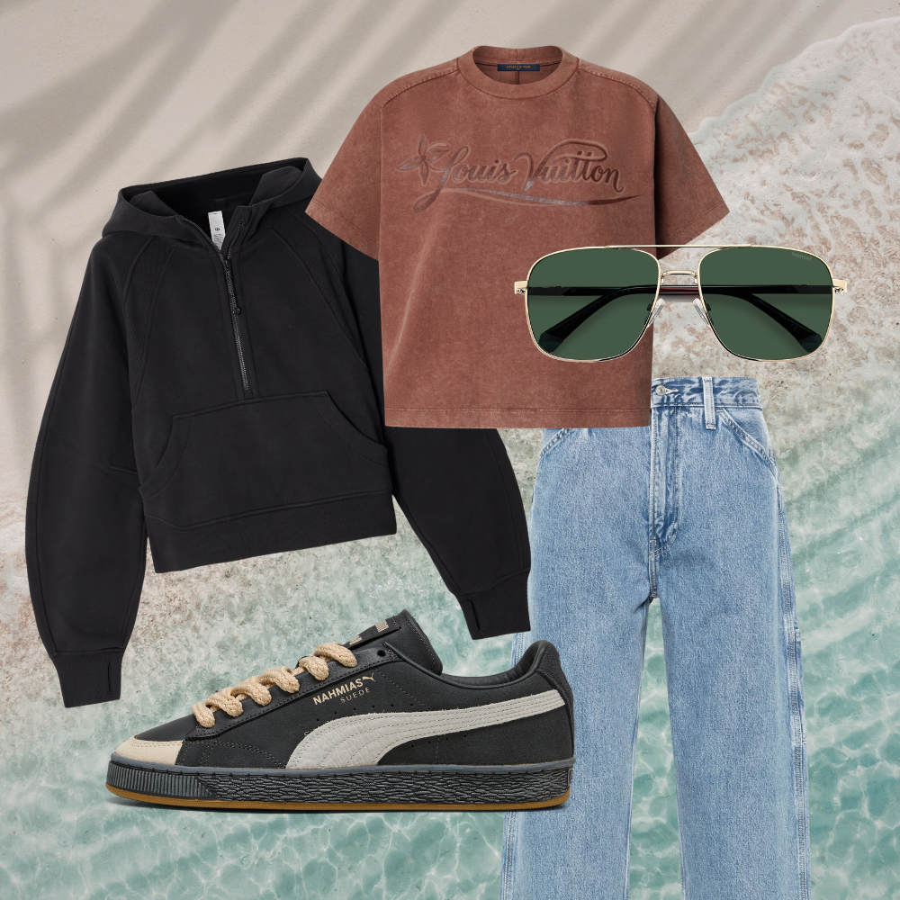 Playera, Louis Vuitton. Sudadera, lululemon. Jeans, Levi’s. Lentes, Polaroid. Tenis, Puma x Nahmias. Cortesía: de las marcas.